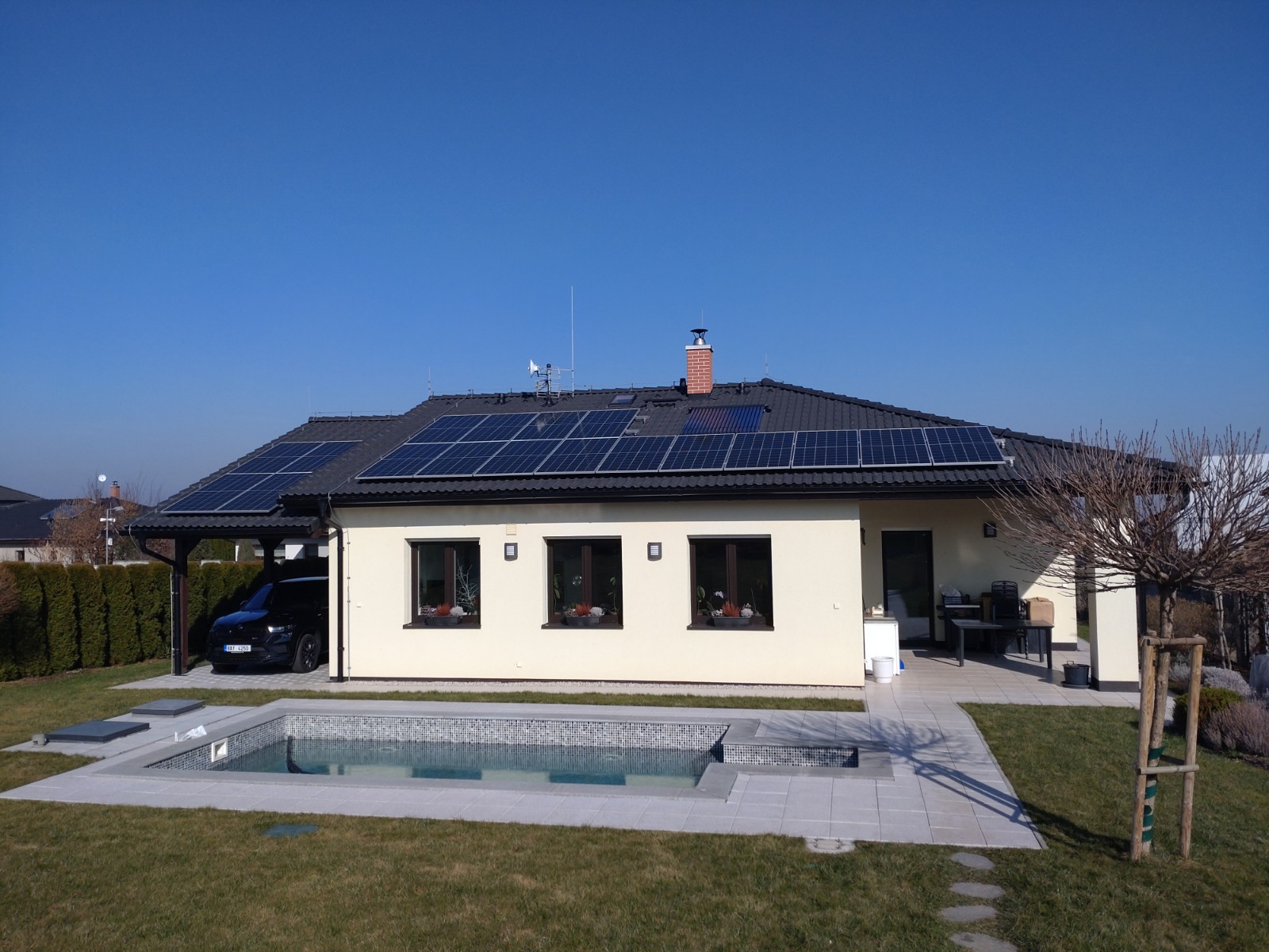 RD Škvorec – 9,9kW – šikmá střecha tašky – střídač i baterie SOLAX